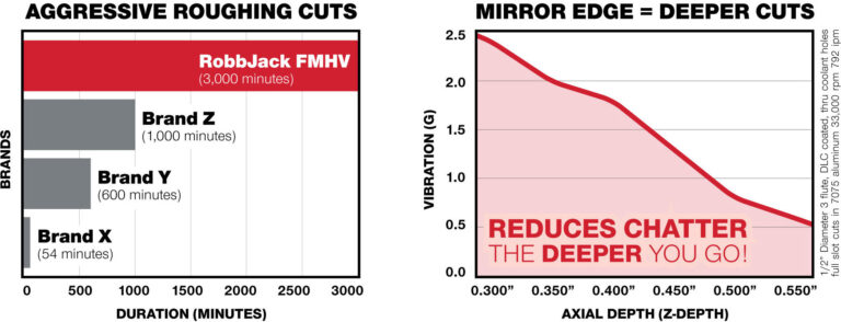 Mirror edge allows you to take deeper Z-depths of cuts reducing vibration the deeper you go. Ability to go more than 450% deeper than stability lobes predict. 1/2” diameter, 3 flute with DLC coating and thru coolant holes.